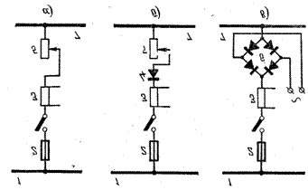 Прямой дренаж (рис. 6, а) может применяться только на участках с постоянным направлением блуждающих токов, так как иначе он будет усиливать коррозию. Поляризованный содержит диод, пропускающий ток в одном направлении (рис. 6, б). Усиленный дренаж содержит дополнительный источник постоянного напряжения (рис. 6, в) для повышения эффективности работы.