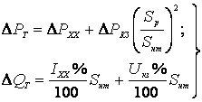 Потери активной и реактивной мощности в понизительных трансформаторах с высшим напряжением 6¸20 кВ определяются в зависимости от действительной (расчётной) нагрузки (Sp):