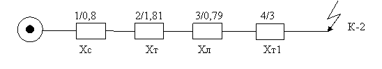 Суммарное сопротивление от источника питания до точки короткого замыкания (К-2) в относительных базисных единицах составляет: