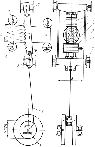 Принципиальная схема лесопильной рамы показана на рис.3. Под действием кривошипно-шатунного механизма 2 с главным валом 1 пильная рамка 3, в который натянуты пилы 8, совершает возвратно-поступательное движение в направляющих 7. Поскольку рамка установлена с некоторым наклоном, то при движении вниз пилы врезаются в древесину, а при движении вверх зубья отводятся от дна пропила; Распиливаемое бревно 5 надвигается на пилы с помощью нижних 4 и верхних 6 вальцев. Нижние вальцы не меняют своего положения, а верхние являются «плавающими», высота их меняется в зависимости от изменения диаметра распиливаемого бревна или толщины бруса.