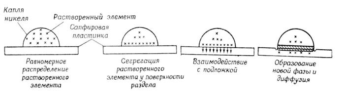 Результаты упоминавшихся исследований вообще показывают, что разные легирующие элементы усиливают смачивание, сегрегируя на поверхности окиси алюминия и вступая в реакцию с ней. Подобное взаимодействие и диффузия легирующих элементов в окись алюминия упрочняют сцепление. Однако разъедание поверхности или внутренние напряжения, возникающие при взаимодействии, понижают прочность соединения. Таким образом, химическое взаимодействие и диффузия избыточных атомов растворенного вещества, сконцентрированных у поверхности раздела, способны привести к общей утрате прочности соединения. Действие этих двух противоположных процессов: