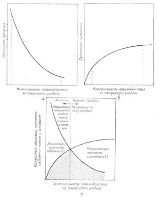 Прочность подложки понижается с ростом интенсивности взаимодействия, в то время как сила сцепления и протяженность зоны взаимодействия становятся больше. Оптимальной интенсивности взаимодействия на поверхности раздела соответствует максимальная прочность соединения. Если превысить эту оптимальную интенсивность взаимодействия, то хрупкая фаза разрушается при низких уровнях прочности. Таким образом, для обеспечения максимальной прочности сцепления и минимального повреждения подложки необходимо ограничить интенсивность химического взаимодействия на поверхности раздела.