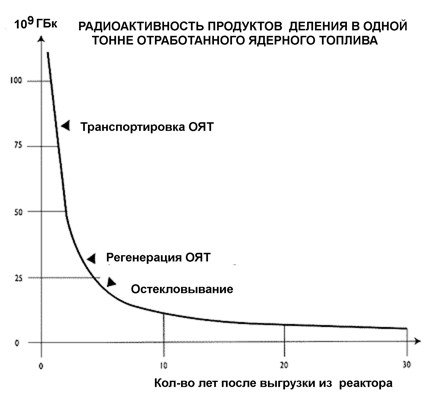 Уменьшение уровня радиоактивности продуктов деления в одной тонне отработанного ядерного топлива PWR реактора