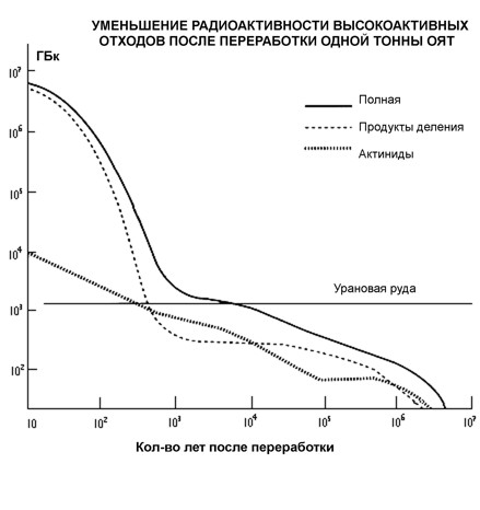 Степень опасности иллюстрируется на Рисунке 16B (подобная картина имеет место и для отработанного ядерного топлива). Из приведенных данных можно сделать два важных вывода. Первый состоит в том, что степень радиационной опасности уменьшается в тысячу раз за период времени от 10 до 1000 лет, с относительно небольшим последующим изменением. Это связано с тем, что почти все короткоживущие продукты деления распадаются за это время до незначительных концентраций.