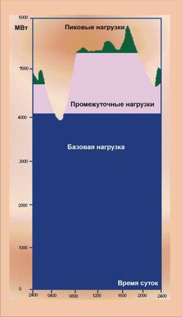График нагрузки Викторианской (Австралия) электросети в течение одного зимнего буднего дня. Показаны относительные вклады пиковой, промежуточной и базовой нагрузки. Форма кривой заметно изменяется в соответствии с характером потребления электроэнергии: пики отражают увеличение потребления в течение дня, связанное с необходимым отоплением помещений. Заметим, что при базисном потреблении приблизительно в 4100 МегаВатт, общее производство электроэнергии должно иметь резерв, по крайней мере, на 50 % больше этой величины. Последнее может быть обеспечено дополнительной электростанцией с промежуточной загрузкой мощности или регулируемым выходом мощности основной электростанции. Максимальные нагрузки обычно компенсируются дополнительными гидро- или газо-турбинными генераторами. Конкуренция на рынке производителей электроэнергии, несомненно, может способствовать принятию более оптимальных решений при определении необходимых источников дополнительной энергии в моменты пиковых нагрузок.