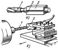 Для сверления отверстий применяют спиральные сверла, которые изготовляют из инструментальных сталей (углеродистой У12А и легированной 9ХС), из быстрорежущих сталей (Р6М5 и др.), а также из твердых сплавов (ВК6М, ВК8М и ВК10М). Для сверл из быстрорежущих сталей скорость резания v = 25-35 м/мин, для сверл из инструментальных сталей v = 12-18 м/мин, для твердосплавных сверл v = 50-70 м/мин. Причем большие значения скорости резания принимаются при увеличении диаметра сверла и уменьшении подачи. При ручной подаче сверла трудно обеспечить ее постоянное (стабильное значение). Для стабилизации подачи используют различные устройства. Для механической подачи сверла его закрепляют в резцедержателе. Сверло 1 с цилиндрическим хвостовиком, рисунок слева - а) с помощью прокладок 2 и 3 устанавливают в резцедержателе так, чтобы ось сверла совпадала с линией центров. Сверло 1 с коническим хвостовиком, рисунок слева - б) устанавливают в державке 2, которую крепят в резцедержателе.