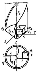 На каждую точку A режущей кромки сверла действует сила Р, которая может быть разложена на составляющие силы Рг, Ру и Рг, Действующие по осям X, Y и Z. Силы Ру на режущих кромках направлены навстречу друг другу и при симметричной заточке равны по величине, т. е. их действие на сверло равно нулю. Осевая сила, действующая вдоль сверла, Ро=2Рx+Рп.к+2Рл где Рп.к - сила, действующая на поперечную кромку сверла; Рл - сила трения ленточки сверла о стенки отверстия. Основную работу при сверлении выполняют две режущие кромки, а поперечная кромка (угол резания которой более 90 градусов) под действием осевой силы Ро сминает металл с силой Pп.к0,5Ро