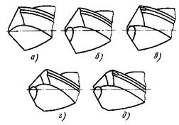 Формы заточки режущей части сверла: а) - нормальная, б) - нормальная с подточкой перемычки, в) - нормальная с подточкой перемычки и ленточки, г) - двойная с подточкой перемычки, д) - двойная с подточкой перемычки и ленточки.