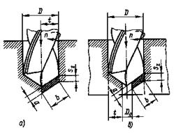 заться чрезмерно большим. Поэтому в таких случаях сверление производят в несколько приемов, т. е. отверстие рассверливают. Режимы резания при рассверливании отверстий те же, что и при сверлении. На рисунке слева элементы резания при сверлении -а) и рассверливании - б) отверстия: n - вращение сверла, Sz - подача приходящаяся на одну режущую кромку, a и b - толщина и ширина срезаемого слоя, t - припуск на сторону, D - диаметр основного отверстия, Do - диаметр предварительно просверленного отверстия.