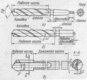 Сверление является одним из распространенных методов предварительной обработки отверстий на токарных станках. В зависимости от конструкции и назначения различают сверла: спиральные, перовые, для глубокого сверления, центровочные, эжекторные и др. Наибольшее распространение получили спиральные сверла (На рисунке сверла: а - спиральное с коническим хвостовиком, б - спиральное с цилиндрическим хвостовиком, в - для