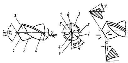 Сверло имеет: две главные режущие кромки, образованные пересечением передних винтовых поверхностей канавок, по которым сходит стружка, с задними поверхностями, обращенными к поверхности резания; поперечную режущую кромку (перемычку), образованную пересечением обеих задних поверхностей; две вспомогательные режущие кромки, образованные пересечением передних поверхностей с поверхностью ленточки.