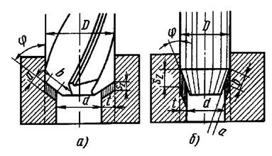 Зенкерование. Зенкером обрабатывают отверстия, предварительно штампованные, литые или просверленные. Рисунок - а). Припуск под Зенкерование (после сверления) составляет 0,5-3 мм на сторону. Зенкер выбирают в зависимости от обрабатываемого материала, вида (сквозное, ступенчатое, глухое) и диаметра отверстия и заданной точности обработки.