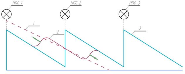 1 – эпюра давления после остановки НПС-2; 2 – изменение давления в момент остановки НПС-2; 3 – эпюра давления до остановки НПС-2