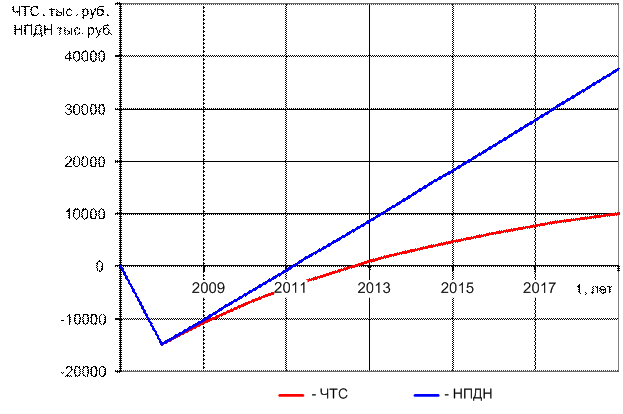 Графики зависимостей НПДН и ЧТС от времени, прошедшего с начала внедрения САР давления изображены на рис. 4.1. Как видно из графиков, проект является экономически эффективным. Срок окупаемости составляет 5,62 года, что немного для подобного долгосрочного инвестирования.