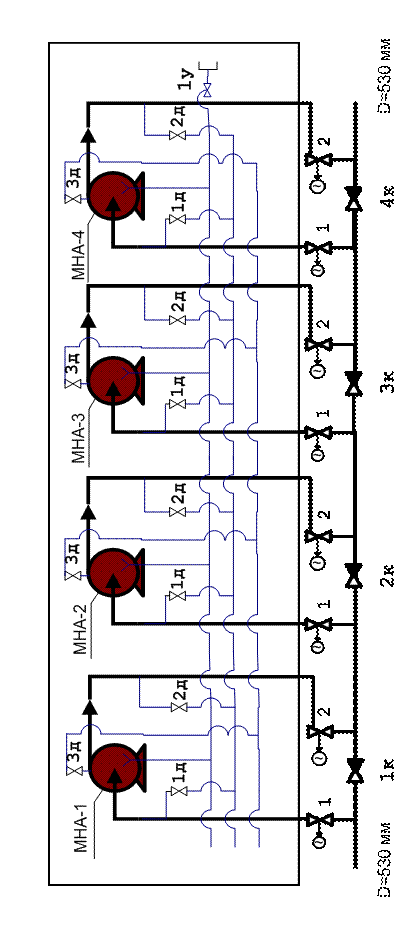 Упрощённая схема обвязки технологических трубопроводов и соединения магистральных насосных агрегатов НПС изображена на рис. 1.3.