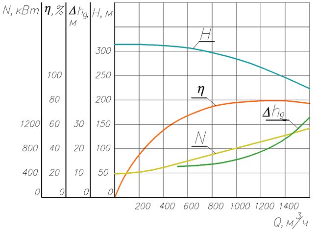 и подачи (количества жидкости, подаваемой в единицу времени) зависят от конструкции и размеров насоса и частоты вращения. Для каждого насоса взаимосвязь подачи Q и напора H при номинальной частоте вращения определяется однозначно и выражается графически (характеристика Q – H). Также на график наносят зависимости изменения мощности N, КПД насоса η и допустимого кавитационного запаса Δhд от подачи Q.