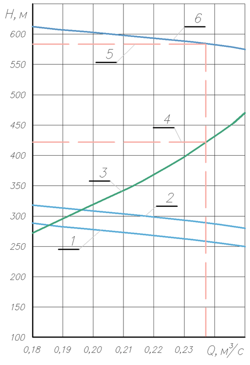 1 – характеристика насоса НМ 1250-260 (n = 0,95nн); 2 – характеристика насоса НМ 1250-260 (n = nн); 3 – характеристика нефтепровода; 4 – потери напора на участке; 5 – напор на выходе НПС; 6 – суммарная характеристика работающих насосов