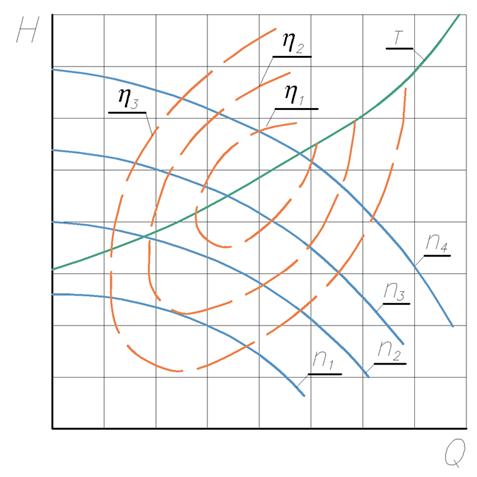 Диапазон регулирования определяется в зависимости от конкретных условий эксплуатации трубопровода. Экономичным при этом является регулирование частоты вращения в небольшой зоне: 30-50% вниз от номинальной скорости, так как при снижении скорости вращения насоса более чем на 50% КПД насоса резко уменьшается [5]. Верхний предел регулирования ограничивается техническими возможностями насосов. Эти возможности зависят от величины и продолжительности перегрузки по частоте вращения роторов, которую насосы способны выдержать без необратимых конструктивных изменений. Так для обеспечения безкавитационной работы серийных центробежных насосов в продолжительном режиме не рекомендуется превышать частоту вращения более чем на 10% [9]. В большинстве случаев данного диапазона для регулирования вполне достаточно, так как напор зависит от квадрата частоты вращения и, следовательно, при регулировании его можно понижать примерно на 50% и повышать на 20% от номинального. Графики характеристик насоса при разных частотах вращения, согласно [5], изображены на рис. 1.7. Частота n3 соответствует номинальной. На характеристики насоса наложена характеристика трубопровода T. Также здесь показаны линии равного КПД, которые обрываются вверху из-за нехватки кавитационного запаса.