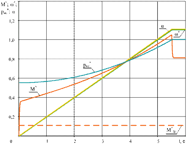 На начальном этапе пуска, пока скорость вращения равна нулю, момент двигателя очень резко, практически скачкообразно, возрастает до момента холостого хода, затем начинает увеличиваться по параболе (вентиляторный момент практически пропорционален квадрату скорости вращения). Когда разгон двигателя завершён, момент опять же практически скачкообразно снижается до статического. При этом броски момента на порядок ниже бросков при прямом пуске, скорость двигателя плавно нарастает на всём протяжении пуска. Перерегулирование по моменту АД составляет σ = 30%. Перерегулирования по скорости и давлению незначительны.