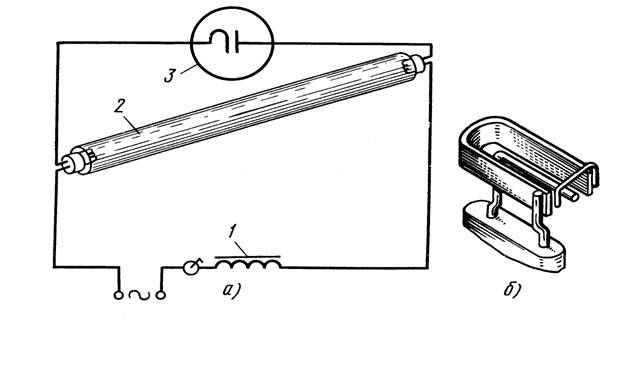 Включают люминесцентную лампу в электрическую сеть только последовательно с балластным резистором, ограничивающим рост тока в лампе, и таким образом предохраняющим её от разрушения. В сетях переменного тока в качестве балластного резистора применяют конденсатор или катушку с большим индуктивным сопротивлением – дроссель