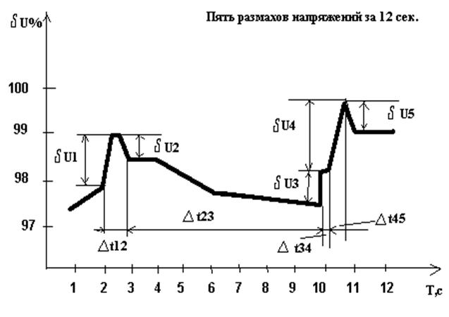1. Размахом изменения напряжения dU т.е. разностью между наибольшим и наименьшим действующими значениями напряжения в процессе достаточно быстрого изменения параметров режима, когда скорость изменения напряжения не менее 1% в секунду
