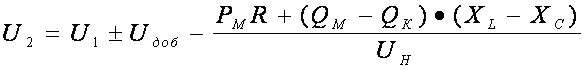 Анализ средств регулирования напряжения удобнее всего провести из рассмотрения общей формулы напряжения у электроприемников U2 в зависимости от напряжения генератора U1, добавочного напряжения Uдоб , создаваемого регулирующими устройствами, и потери напряжения, обусловленной активной нагрузкой PM , реактивной QM, активным сопротивлением сети R и реактивным XL.