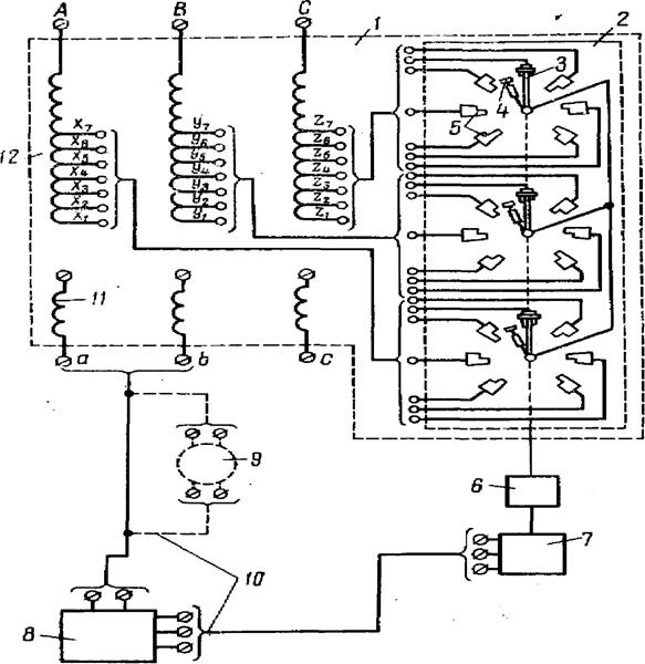 /—трансформатор; 2—переключатель ответвлений; 3— рабочий контакт переключателя; 4—вспомогательный контакт; 5—неподвижный контакт; 6—редуктор привода; 7—электродвигатели привода; 8—система автоматического управления; 9—трансформатор напряжения типа ТСМАН-630/35; /О—соединительные провода;, II—обмотка низшего напряжения; 12—обмотка высшего напряжения