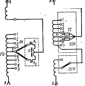 Рис . Схема регулируемых трансформаторов с шестью ступенями регулирования.