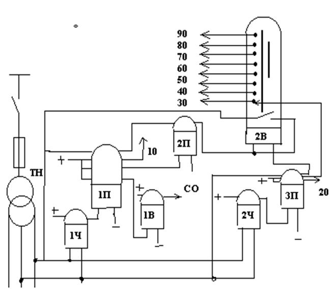 Если после отключения первой очереди потребителей частота в сети не восстанавливается, то срабатывает частотное реле 2Ч и отключается вторая очередь через промежуточное реле 3П (контакты 20). Далее через контактное кольцо электродвигательного реле 2В отключаются остальные очереди ( контакты 30-90).