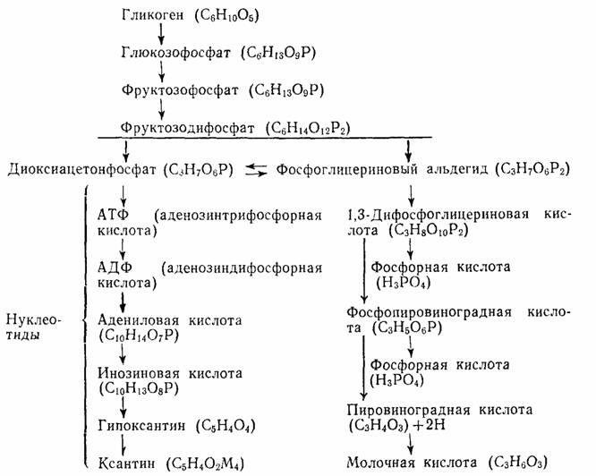 Люндсград показал, что креатинофосфорная кислота находится в мышечных клетках и при сокращении их расщепляется на креатин и фосфорную кислоту (по Палладину), которая соединяется с гексозой (глюкозой). Аденозинофосфорная кислота, содержащаяся в мышцах, также расщепляется с образованием аденозина и фосфорной кислоты, которая дри соединении с гексозой (глюкозой) способствует образованию молочной кислоты (Эмбден и Цимммерман).