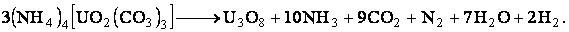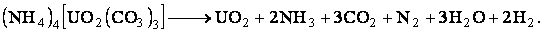 В этом же интервале температур, но в инертной атмосфере или под вакуумом разложение аммонийуранилтрикарбоната сопровождается образованием диоксида урана: