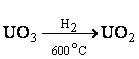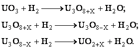 На первой стадии UO3 превращается в U3O8+X, имеющую ромбическую структуру и являющуюся верхним пределом области гомогенности U3O8. Вторая стадия протекает при гомогенном переходе от верхнего к нижнему пределу U3O8-X. На последней стадии происходит превращение в кубическую структуру UO2. Скорость восстановления на каждой из этих стадий различна и выражается своим кинетическим уравнением.