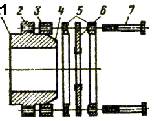 Инструмент крепят винтами на конце шпинделя вращающегося с частотой 3—5 тыс. об/мин, к барабану (рис. 5) с помощью колец, имеющих сферический выступ на одном и соответствующую впадину на другом, чем обеспечивается необходимый предварительный натяг диска. Окончательное натяжение диска обеспечивается при установке его на барабан 1. Стягивающими винтами 7 уменьшают зазор между буртиком 2 барабана 1 и зажимными кольцами 5. Режущий диск 6 при этом упирается в опорный выступ 4 барабана и растягивается в радиальном направлении. Между зажимными кольцами и буртиком барабана устанавливают регулирующие прокладки 3, которые ограничивают перемещение колец 5 и предохраняют диск от разрыва из-за чрезмерного натяжения. Равномерного натяжения диска достигают последовательным постепенным затягиванием диаметрально расположенных винтов 7