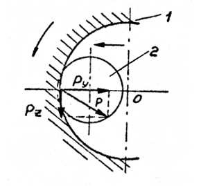 Режим резки выбирают в зависимости от вида полупроводникового материала, диаметра слитка, толщины отрезаемых пластин. Процесс резки характеризуется абразивным съемом материала связанным зерном и характеризуется прерывистым контактом между инструментом и изделием ( вследствие погрешности геометрии инструмента ), что приводит к ударному взаимодействию. Схема сил, действующих при резке, показана на рис.7. Отношение составляющих Pz/Py для кремния лежит в пределах 0,3-0,5.
