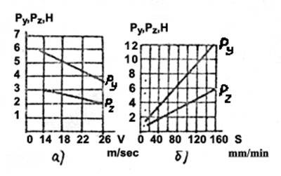 Зависимость сил Py и Pz при резке слитков кремния от окружной скорости V круга и подачи S слитка показана на рис.8.