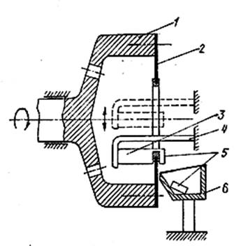 Резку диском с внутренней алмазной режущей кромкой осуществляют следующим образом (рис.9). Диск 2 закрепляют в шпинделе и растягивают в радиальном направлении для придания ему большей жесткости. Слиток 3, закрепленный в державке 4, разрезают алмазоносной кромкой вращающегося диска при перемещении слитка или диска в направлении, перпендикулярном оси барабана. Отрезанные пластины 5 попадают в сборник, заполненный водой, остаются на оправке в случае приклейки по способу (б) и (в) (см. рис.2) или удаляются вакуумным съемником.