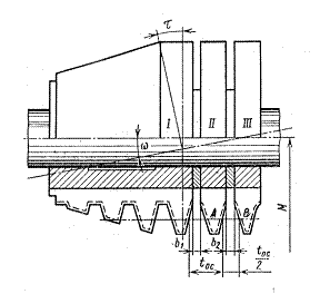 На одну оправку с червячной фрезой насажена вторая промежуточная часть II. Между первой и второй частью проставлено кольцо определенной ширины b1. На второй части имеются зубья, затылованные по бокам, а по вершине – незатылованные.