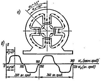 а — чередование полюсов; б — распределение индукции в воздушном зазоре