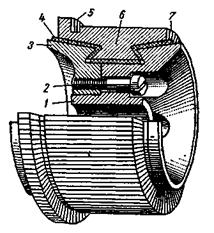 1 — корпус; 2 — стяжной болт, 3 — нажимное кольцо; 4 — изоляционная прокладка; 5 — «петушок» — часть коллекторной пластины, к которой припаивается конец секции обмотки; 6 — «ласточкин хвост» — часть коллекторной пластины, служащая для ее крепления; 7 — коллекторная пластина