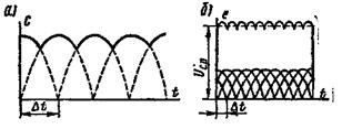 Из выражения (3) следует, что при равномерном вращении якорной обмотки изменение э.д.с е проводника во времени (см. рис. 3, б) в соответствующем масштабе повторяет кривую распределения индукции в воздушном зазоре Вα, (см. рис. 3, а). Анализируя кривую изменения э.д.с. во времени, видим, что в проводниках якорной обмотки индуктируется переменная э.д.с.