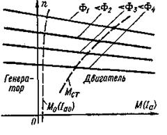 Точка холостого хода двигателя (М = М0, Ia = Ia0) лежит несколько правее оси ординат на рис. 9. С увеличением скорости вращения n вследствие увеличения механических потерь М0 и I00 также увеличиваются. Если в этом режиме с помощью приложенного извне момента вращения начать увеличивать скорость вращения n, то Еа=ceФδт будет увеличиваться, а Iа и М будут, согласно равенствам