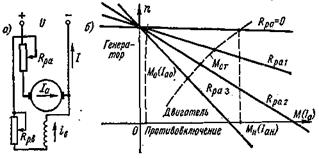 Рис. 10. Схема регулирования скорости вращения двигателя параллельного возбуждения с помощью сопротивления в цепи якоря (а) и соответствующие механические и скоростные характеристики (б)