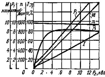 Одновременно с увеличением мощности на валу Р2 растет и момент на валу М. Поскольку с увеличением Р2 и М скорость n несколько уменьшается, то М = Р2/п растет несколько быстрее Р2. Увеличение Р2 и М, естественно, сопровождается увеличением тока двигателя I. Пропорционально I растет также потребляемая из сети мощность Р1. При холостом ходе (Р2 = 0) к. п. д. η= 0, затем с увеличением Р2 сначала η| быстро растет, но при больших нагрузках в связи с большим ростом потерь в цепи якоря ηснова начинает уменьшаться.