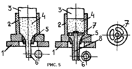 1-основание,2-загрузочная камера,3-поршень,4-выдавливаемый материал,5-матри-ца,6-выдавленное изделие,7-рассекатель,8-стержень.