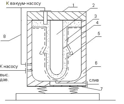 1-крышка,2-стержень,3-эластичная оболочка,4-зона засыпки пресс-порошка,5-кар-кас-ограничитель,6-камера,7-вибрационная площадка,8-трубы к вакуумному насосу.