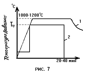 Процесс горячего прессования выполняется в следующей последовательности 1) После загрузки пресспорошка в прессформу порошок предварительно уплотняется, а затем температура порошка с прессформой поднимается до некоторой температуры Тпр меньшей температуры спекания; 2) увеличение давления до нужной для окончательного прессования величины; 3) увеличение температуры до температуры спекания и выдержка при этой температуре под давлением; 4) снятие давления, охлаждение и съем изделия (рис.7).