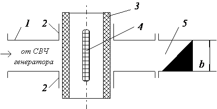 1 — прямоугольный волновод (b — размер узкой стенки); 2 — экранирующие запредельные трубки; 3 — разрядная диэлектрическая трубка; 4 — плазменный шнур; 5 — согласованная нагрузка.
