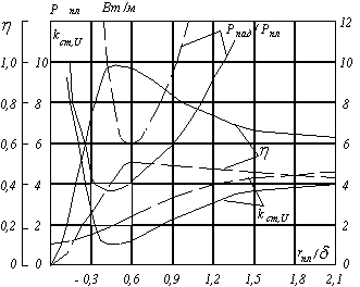 На рис. 8 приведены расчетные кривые Kстv в подводящем волноводе axb=72x34 мм с волной H10 и коэффициента передачи СВЧ энергии в разряд h для плазмотрона с согласованной нагрузкой (пунктирные линии). Рабочая длина волны 12,6 см; внутренний диаметр экранирующих трубок 2R=22 мм; диаметр плазменного шнура 2 rпл =7 мм. Отношение rпл /R в расчетные формулы входит под знаком логарифма, поэтому оно мало влияет на характеристики плазмотрона. В качестве плазмообразующего газа использовался азот при атмосферном давлении.
