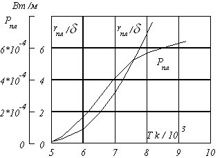 Граница устойчивости разряда соответствует значениям rпл/s @ 0,3¸0,6. При этом, например, температура плазмы азота равна 5500 — 5800K. Удельная мощность Pпл, требуемая для поддержания в плазме заданной температуры, может быть определена по кривой, приведенной на рис. 9. Далее по кривым Pпад/Pпл на рис. 8 можно определить и значение Pпад, при которой в плазме температура равна требуемому значению.