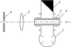 1 — магнетрон; 2 — плазмотрон волноводного типа; 3 — согласованная нагрузка; 4 — кварцевая трубка для подачи плазмообразующих газов и образования плазменного столба; 5 — конденсор; 6 — щель анализатора спектра.